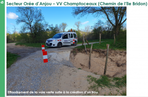 Cette section d’environ 1,8 km entre le pont d’Oudon et les secteurs aval, le chemin présente de nombreuses dégradations liées à la crue (formation de trous, déplacements de matériaux, affouillements). Nous avons constaté de fortes altérations de la piste, nécessitant :