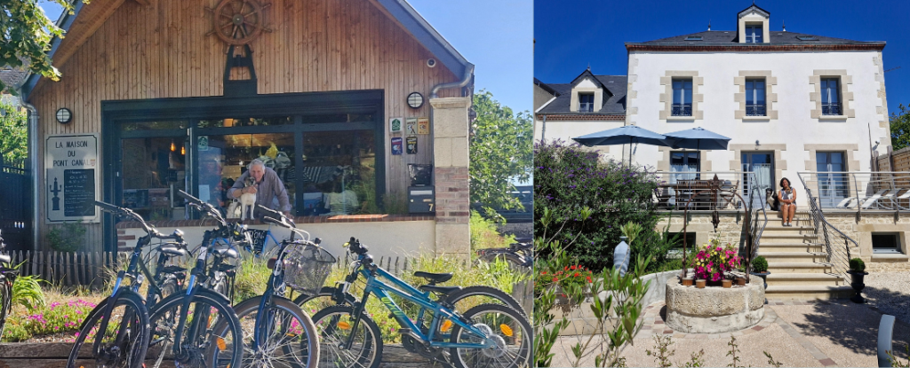 Pascale : On a monté avec mon compagnon Jean-Michel, la Maison du Pont-Canal en 2021, c’était un peu un double projet parce qu’à l’origine c’était une vieille maison. On l’a restauré, c’est aujourd’hui un gîte de 3 chambres et 1 suite, et on a construit au bout de son jardin, une maison en bois, devenue une boutique de produits du terroir et au fil du temps, on a fait évoluer l’activité pour répondre à différentes demandes. Notamment, celle de faire de la location de vélo, ce qui n’était pas du tout prévu au départ, mais la chance que nous avions, c’est que mon compagnon est mécano de métier, c’est ce qui nous a permis d’acheter notre propre flotte de vélo, et donc de pouvoir l’entretenir de manière autonome.