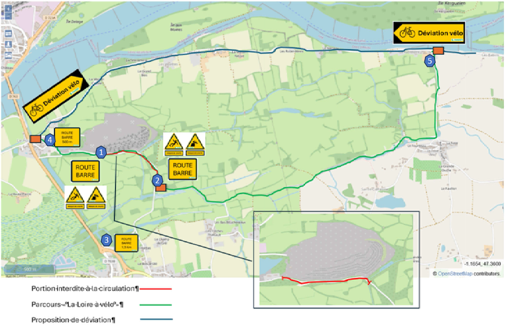 La voie au droit de la carrière du Fourneau à Liré est fermée par arrêté. Cette fermeture est annoncée sur l’itinéraire jusqu’au 31 décembre 2026.