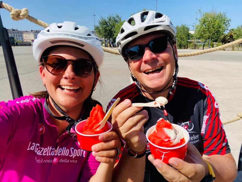 Ciel bleu azur ce matin, magnifique !! La route est toujours magnifique est toute facile, ça roule super bien. Arrivée à Nantes, c’est la 3 ème fois qu’on vient dans cette ville ( mais la 1 ère en vélo !) c’est un vrai petit bijou ! On profite de savourer la meilleure glace fraise du monde, deux ans qu’on attendait d’en remanger une, elle est méritée !