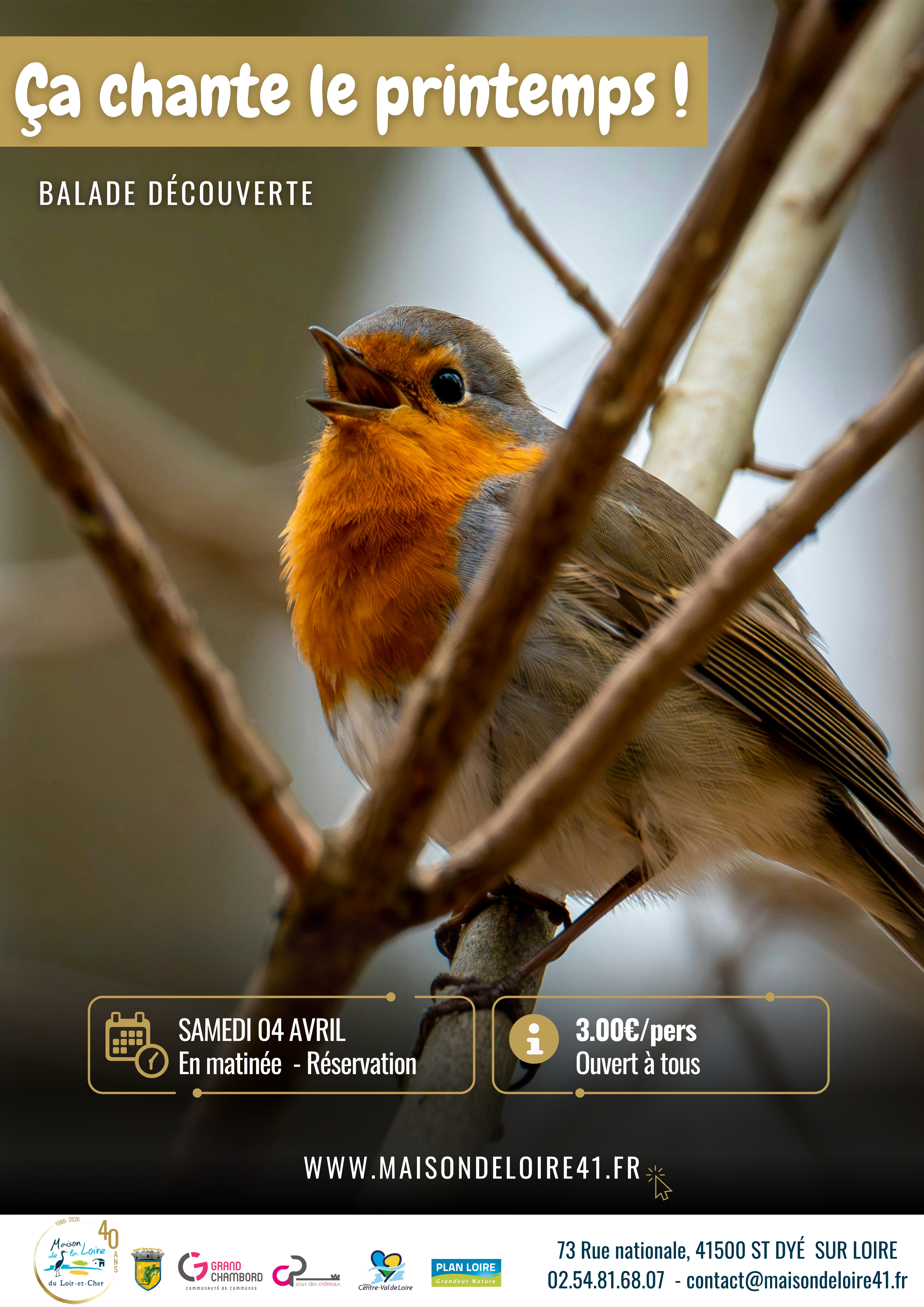 Ça chante le printemps avec la Maison de la Loire. Balade nature accompagnée d’un éducateur à l’environnement pour découvrir le chant des oiseaux. Dans le cadre de l’atlas de la biodiversité de la Communauté de Communes Grand Chambord, nous vous proposons une balade nature accompagnée d’un guide pour découvrir le chant des oiseaux. Ouvrez grands vos oreilles et apprenez à identifier les différentes espèces présentes sur notre territoire. Écoute, identification, observation, une animation pour découvrir les oiseaux de nos jardins.
