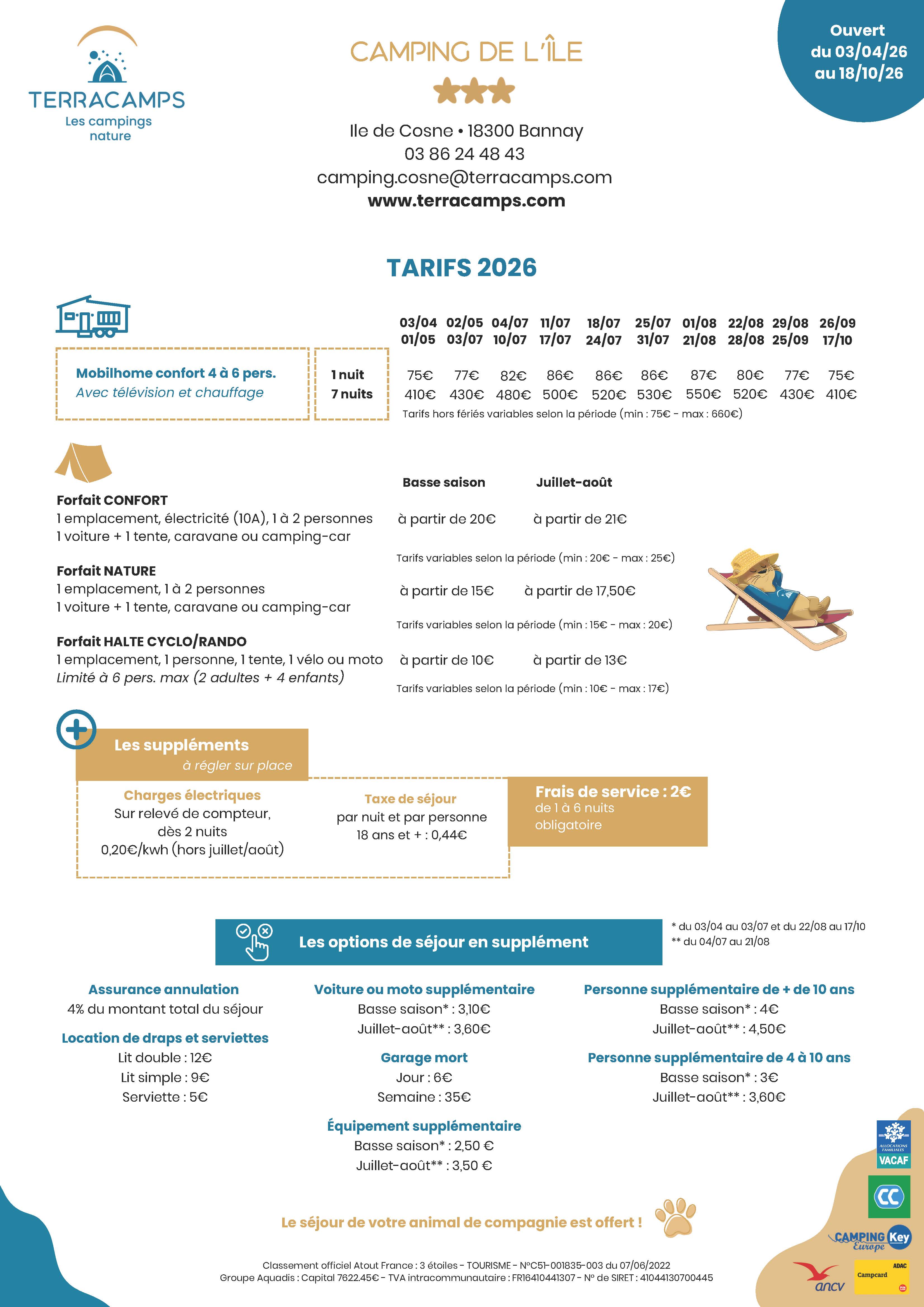 Autre tarif : 75,00 € à 86,00 € Nuitée mobil-home