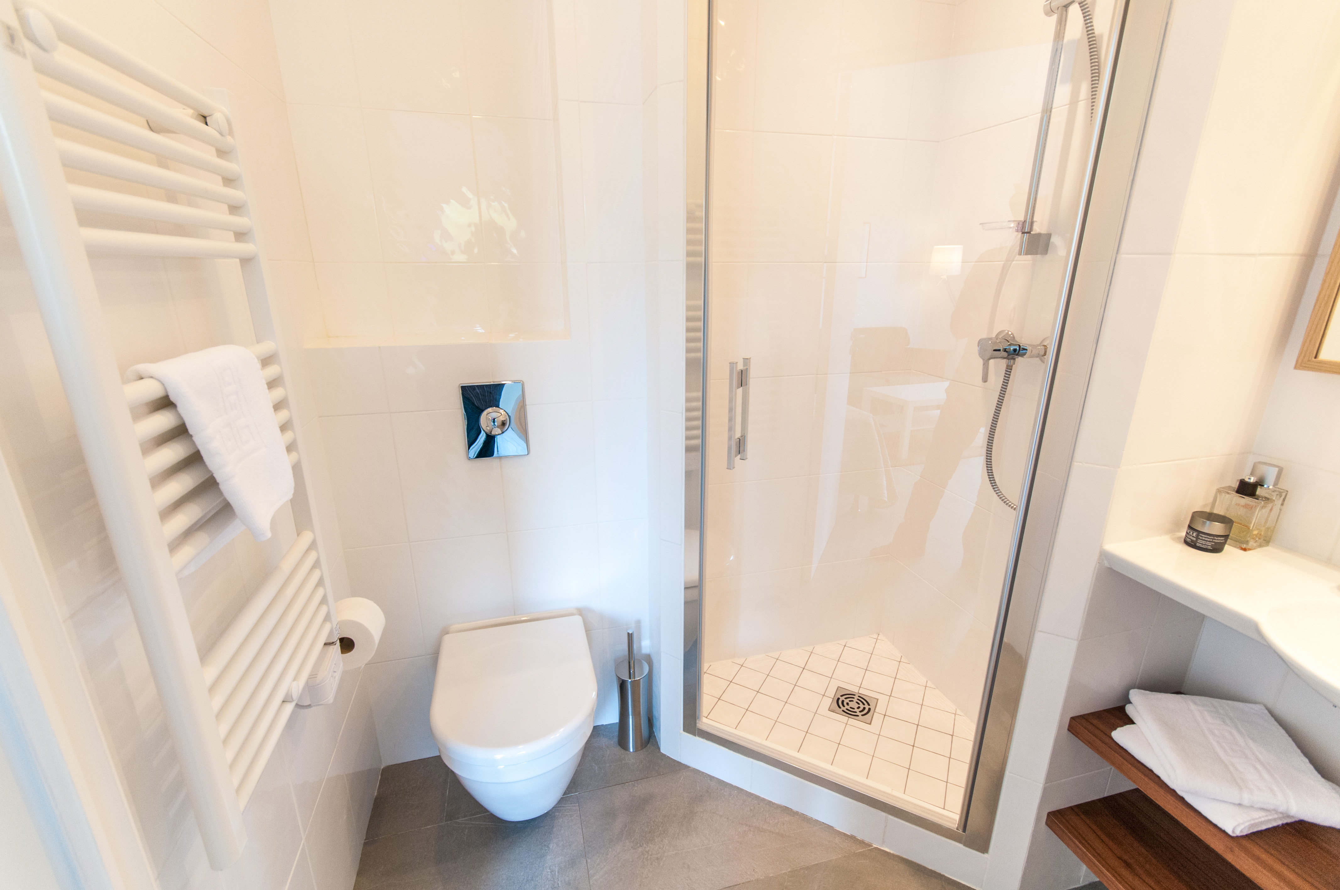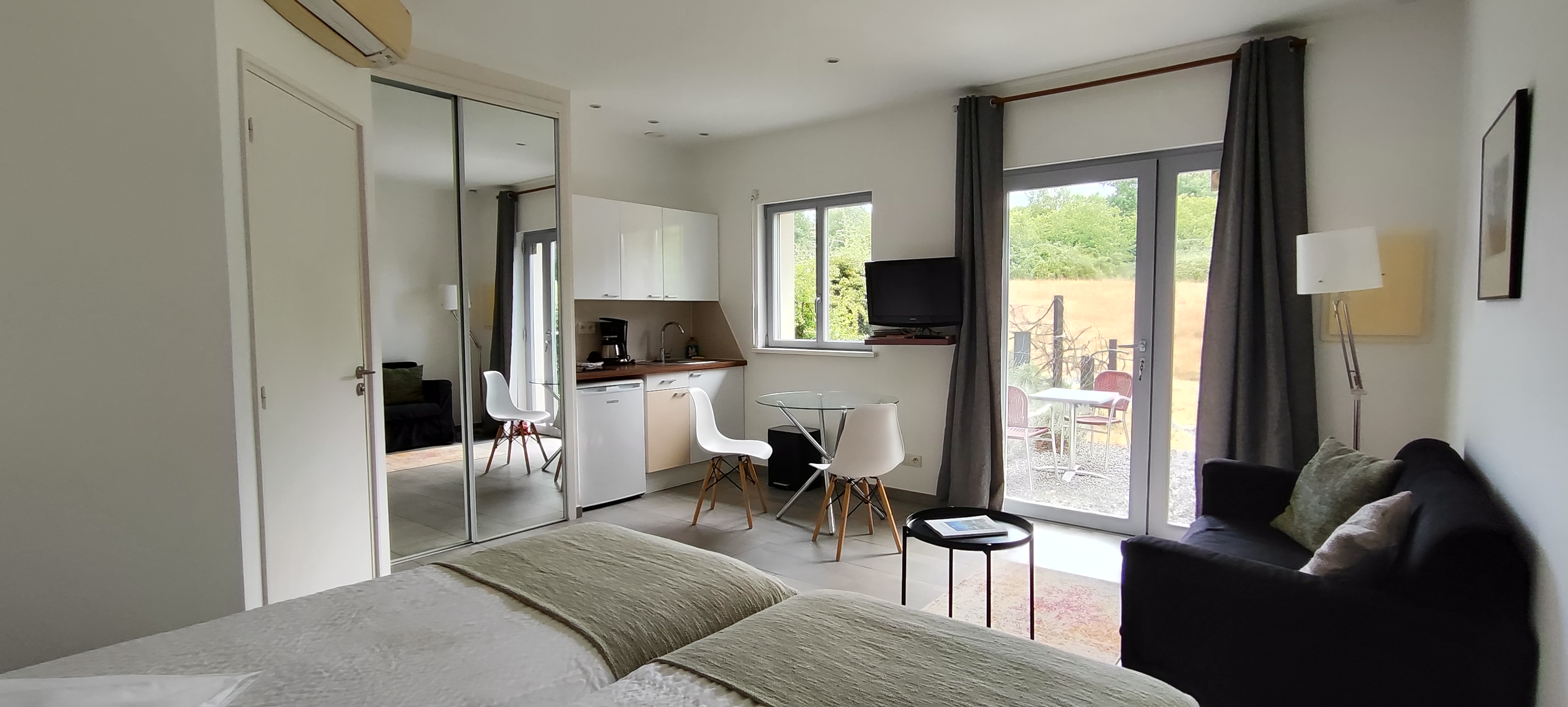 Le Studio 3, en rez-de-jardin, offre un haut niveau de confort grâce à une climatisation réversible, une isolation thermique et sonore avancée et un double vitrage.