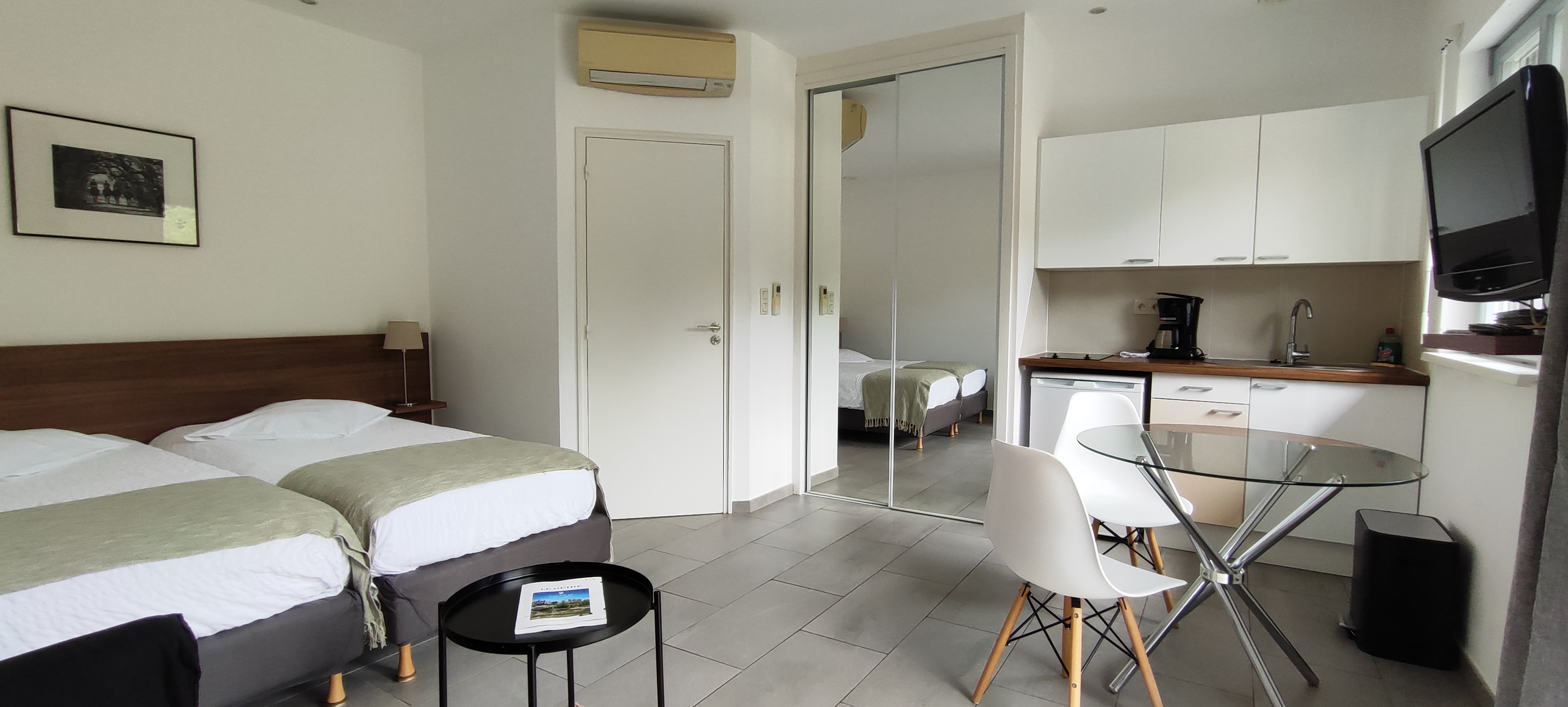 Le Studio 4, en rez-de-jardin, offre un haut niveau de confort grâce à une climatisation réversible, une isolation thermique et sonore avancée et un double vitrage.