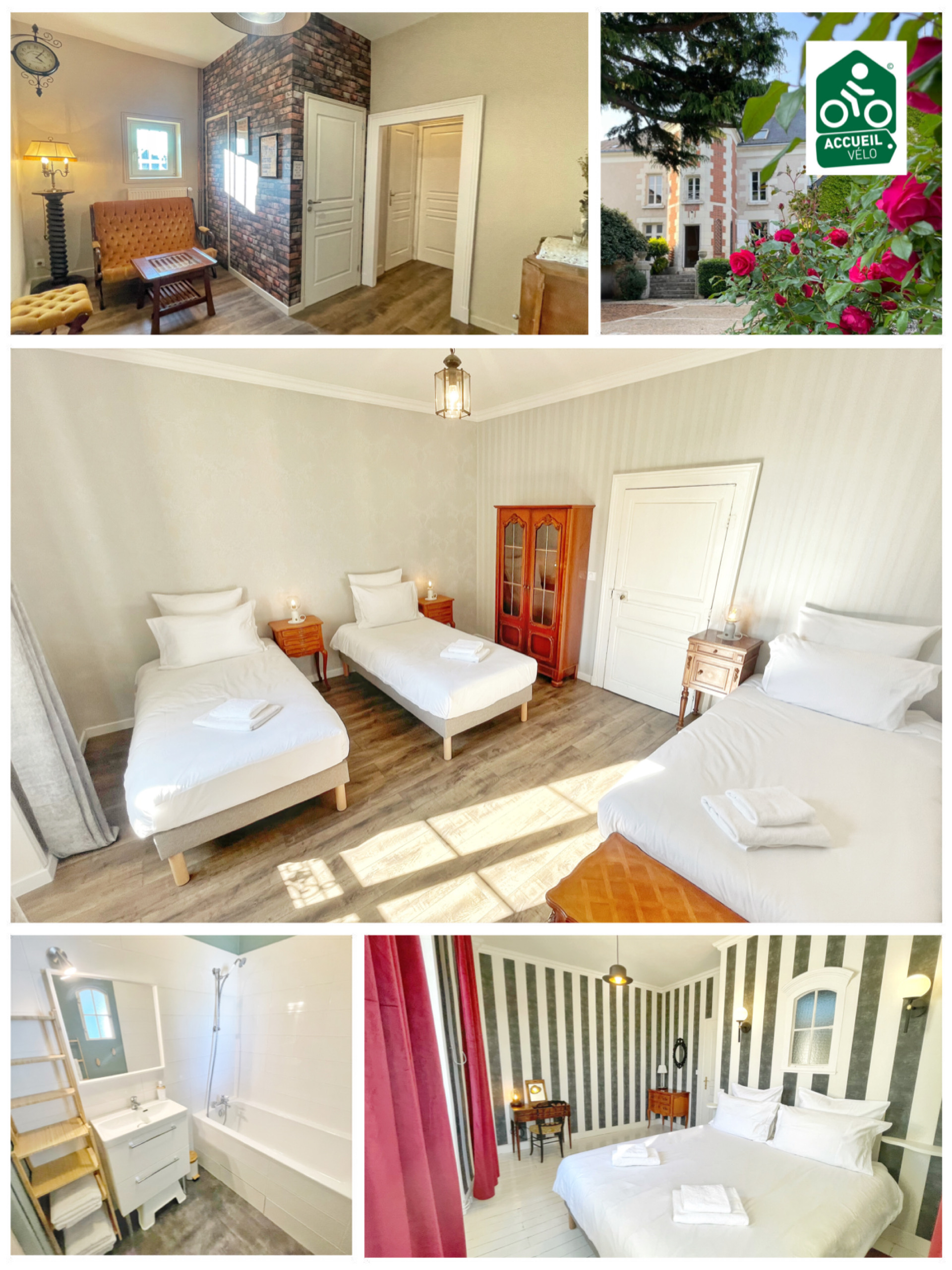 Notre suite d'une capacité de 5 personnes est idéale pour les groupes de cyclistes : chambre double et triple se partageant un salon privé, salle de bain et wc.