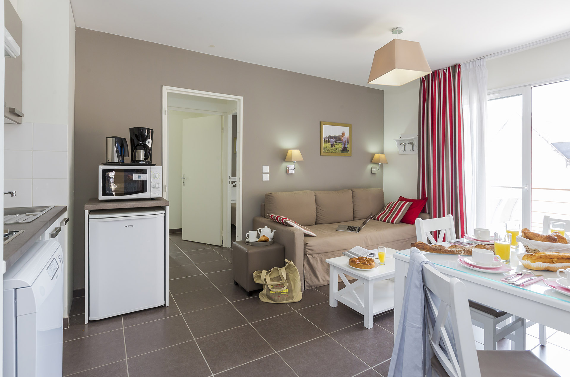 Les appartements (du 2 au 3 pièces) sont composés d’une kitchenette (lave-vaisselle, plaques vitrocéramiques, micro-onde…) et d’un séjour avec TV incluse, ils sont tous prolongés par un balcon ou une terrasse équipés d’un salon de jardin.